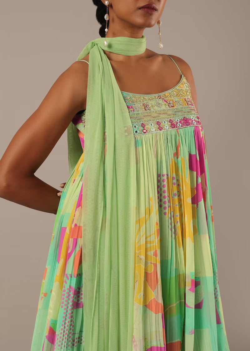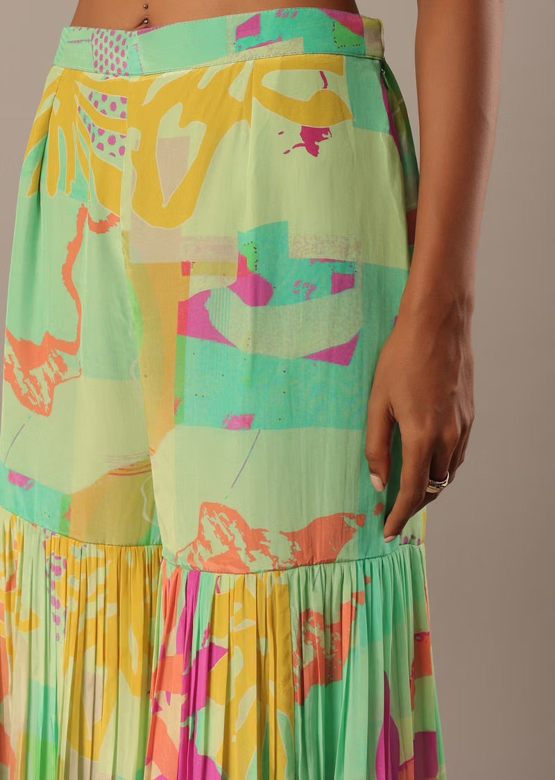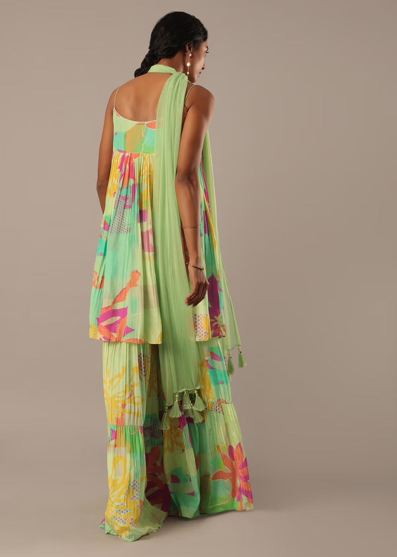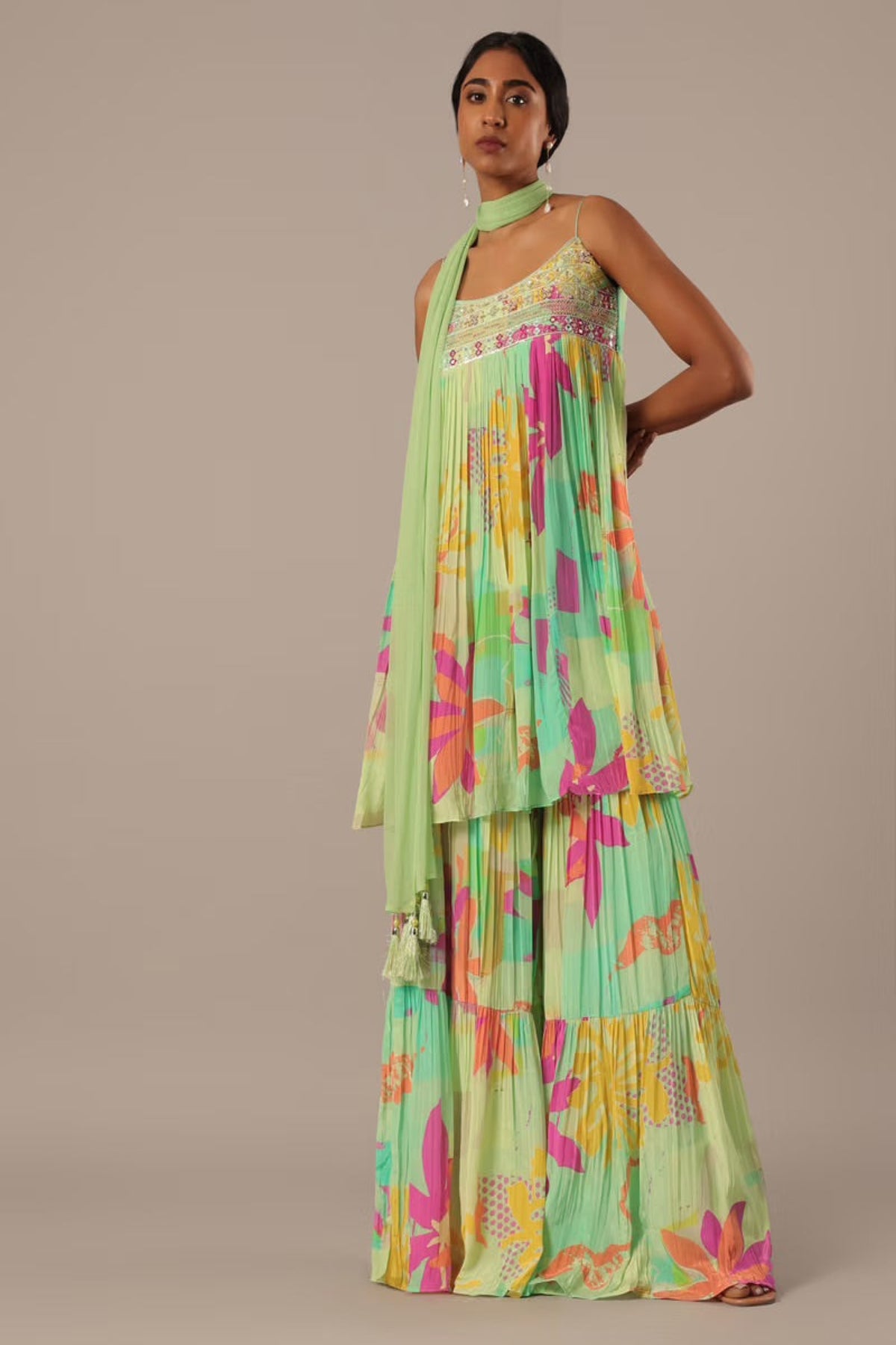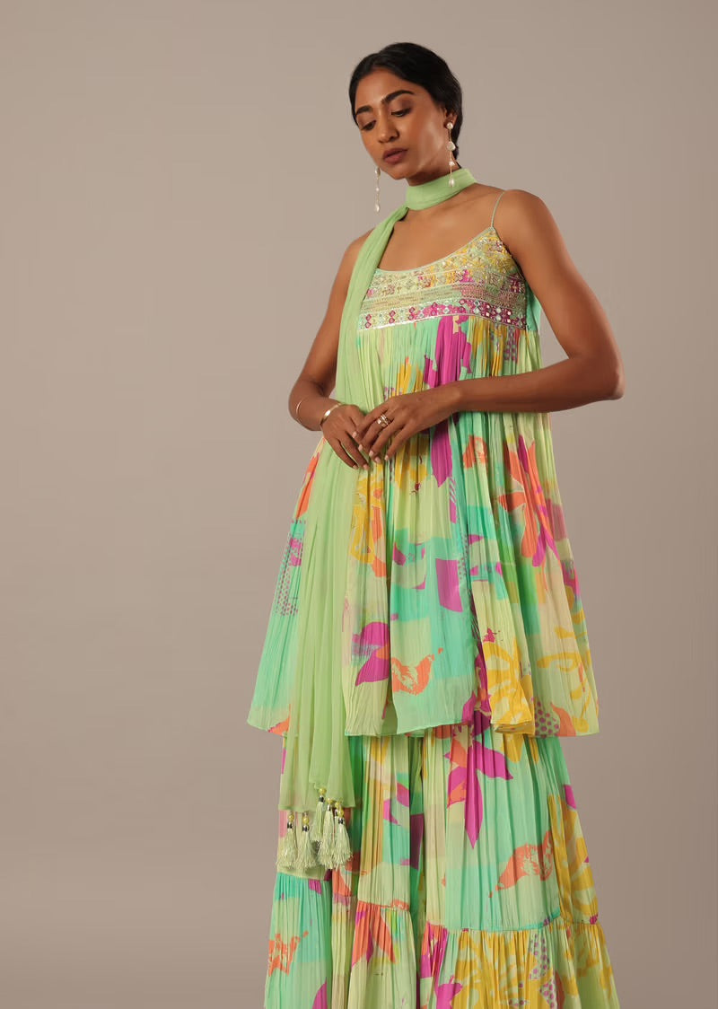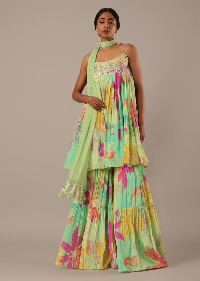 Embroidery: Mirror-worked neckline with fine thread embellishment, paired with coordinated artistic print detailing on the kurta and sharara
