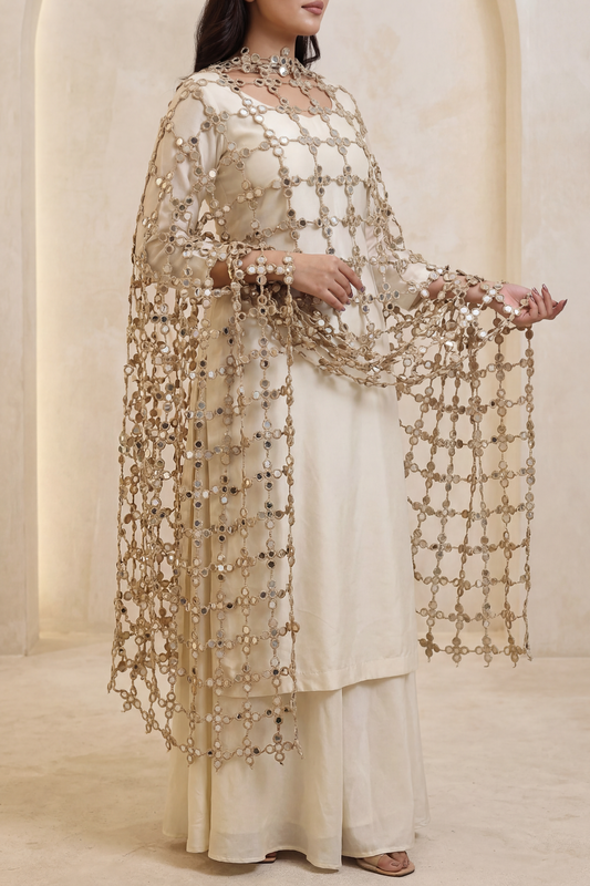 Dupatta: Sheer embellished dupatta with subtle bead accents, draped effortlessly for an ethereal finish