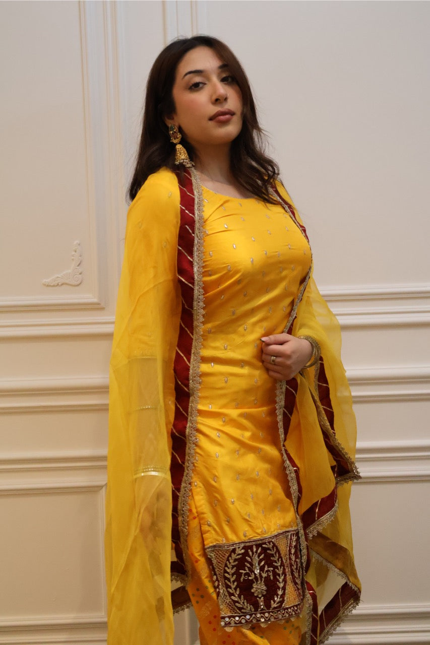 Embroidery: Gold thread and sequin detailing throughout the kurta, paired with maroon embroidered borders on the hem and pants, finished with a sheer dupatta edged in maroon and gold