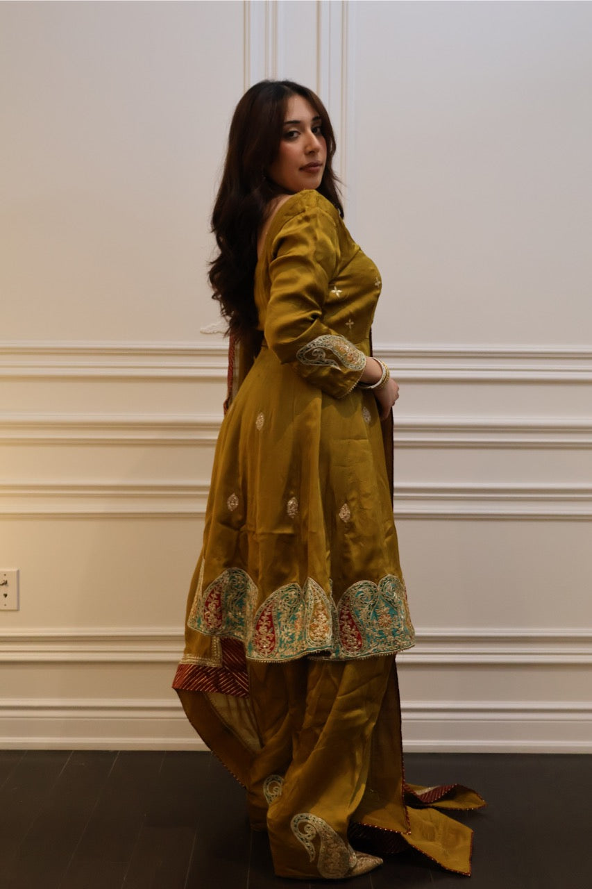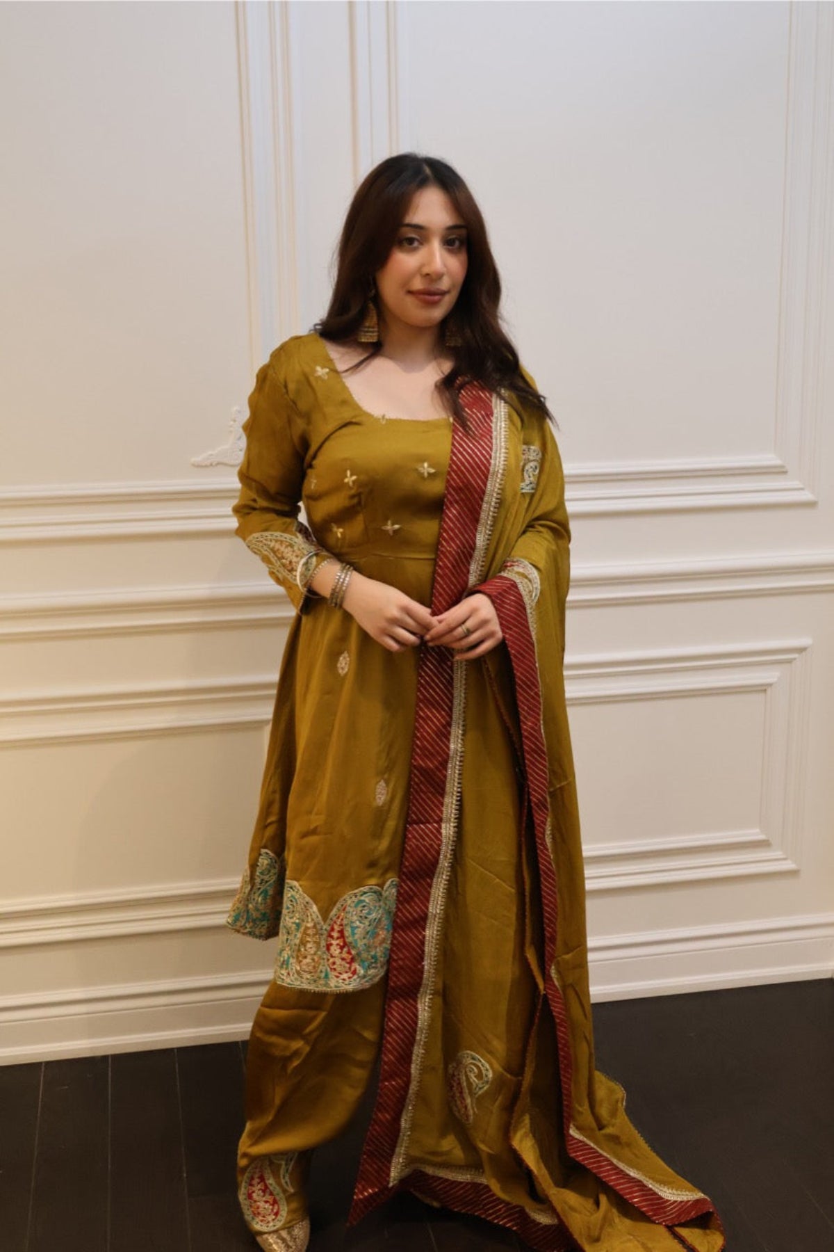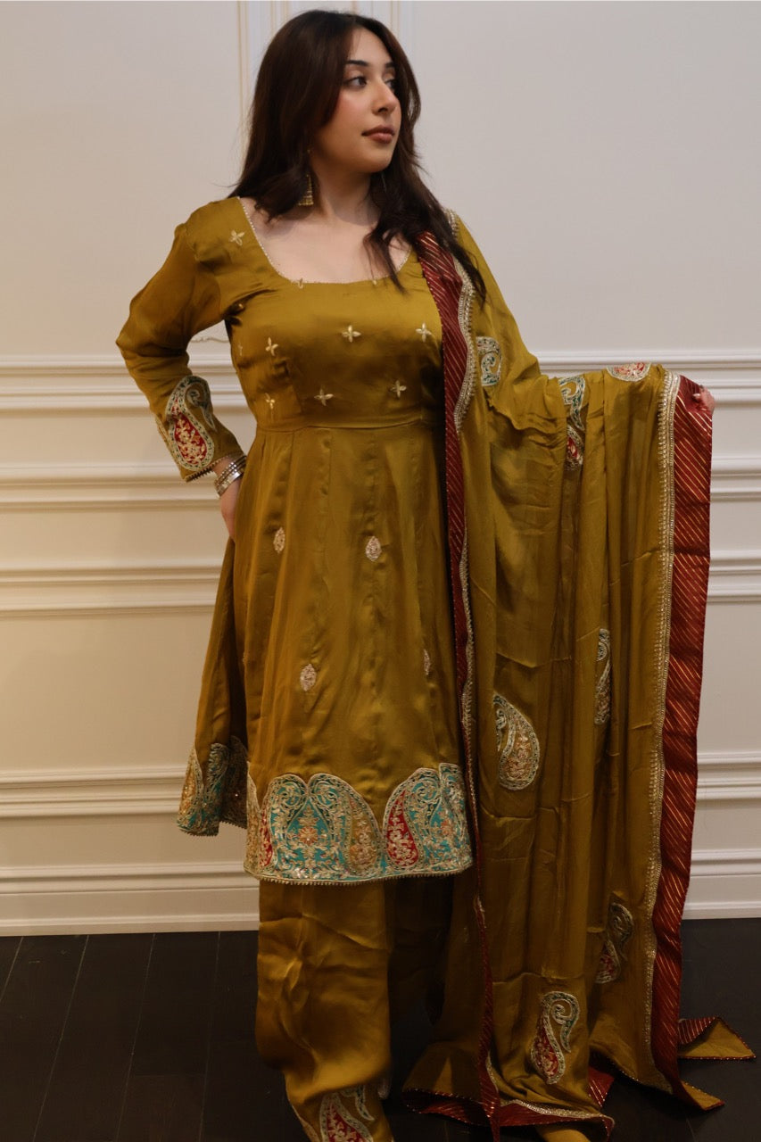 Embroidery: Intricate resham and zari motifs along the hem and trousers, paired with a striped dupatta edged in gold finishing