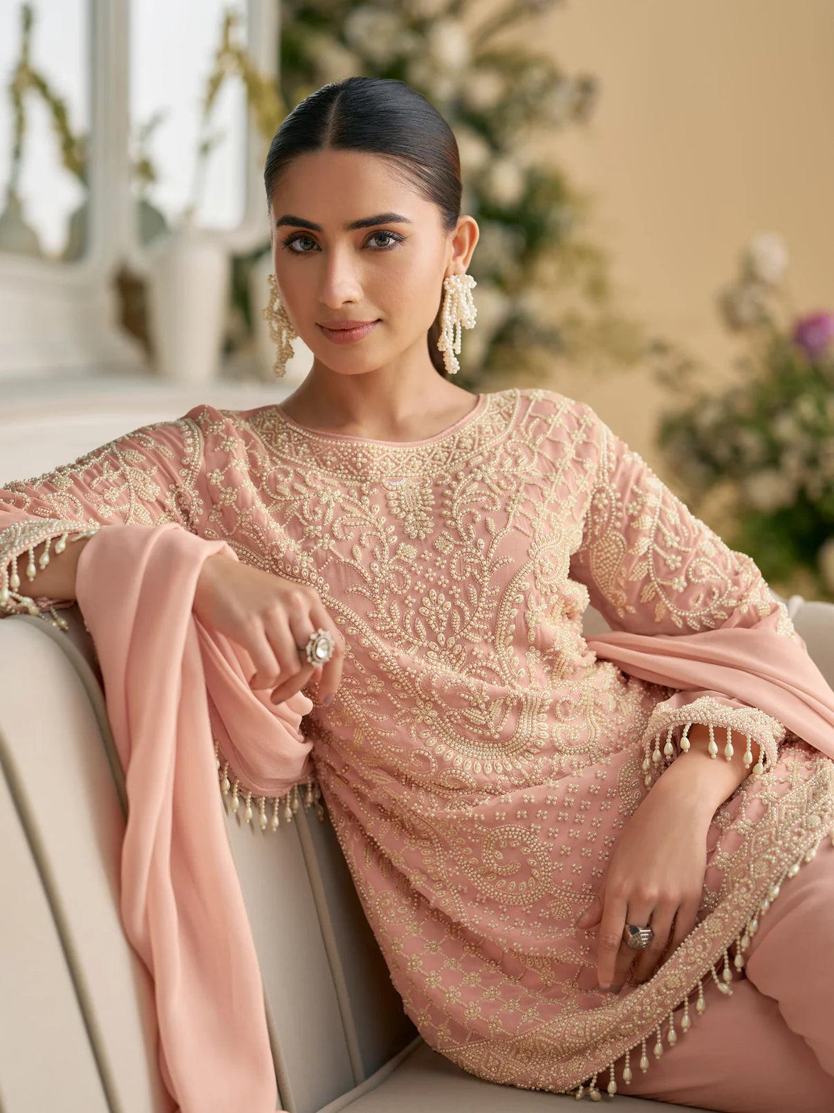 Embroidery: Fully hand-embroidered pearl, sequin, and zari detailing with scalloped hems and tassel edging on the dupatta